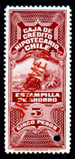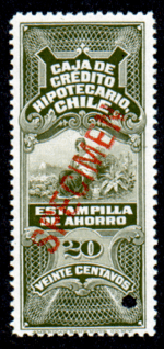 La Caja Nacional de Ahorros Chile, fue fundada en 1884 y pasó a formar parte, junto con la Caja de Crédito Hipotecario y otras instituciones financieras lo que hoy es nuestro Banco del Estado de Chile. En el año 1909 estas instituciones fueron autorizadas según Ley Nº.2213 publicada el 10 de Septiembre de 1909 en el Diario Oficial, a emitir estampillas de ahorro en los valores de 20 centavos, $1 y $5 que serían vendidas en las Tesorerías y en las Oficinas de Correos y Telégrafos y servirían para fomentar el ahorro. Este instrumento legal puede ser la base para los sellos ordenados a American Bank Note Co. New York, en el año 1910 y que hemos conocido como muestras grabadas, sobrecargadas diagonalmente "SPECIMEN", dentado 12, en color verde olivo, azul oscuro y carmín.