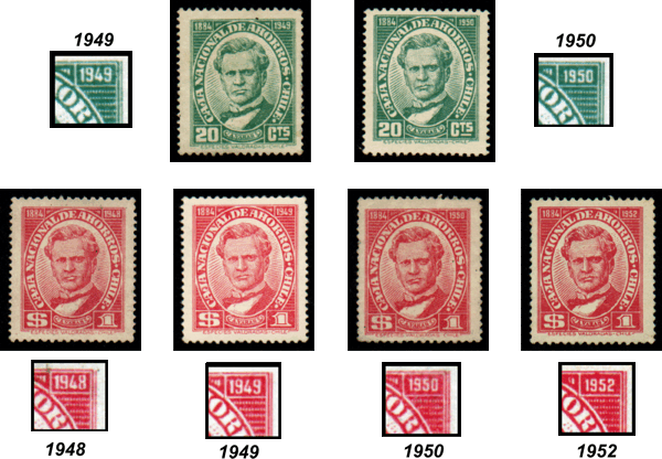En los años posteriores aparecieron otras emisiones de sellos de ahorro, ahora impresos en Chile, hasta que a fines de los años cuarenta, se imprimieron los sellos con la imagen de don Antonio Varas, a la que deseamos referirnos en esta nota. Estos sellos fueron impresos por Talleres de Especies Valoradas en papel sin filigrana, dentado 13-1/4x14. Tal vez por el hecho de venderse en Tesorerías y oficinas de Correos, el público las confundió con las emisiones postales y fueron usadas frecuentemente para franquear correspondencia. Dudamos que haya existido autorización para su empleo como sellos de correo, pero por su aspecto similar, el funcionario de Correos puede haberlas dejado pasar inadvertidamente, cursándose la correspondencia así franqueada sin ser objetada. Tras un estudio podemos establecer que se conocen cuatro valores: 20cts. verde, $1 rojo, $5 azul oscuro y $10 pardo, todos- como decíamos- mostrando la efigie de don Antonio Varas. En la parte superior llevan en la esquina izquierda la fecha 1884, año de la fundación de la Caja Nacional de Ahorros, y en la derecha el año 1948, 1949, 1950, 1952 ó 1955 que suponemos, debe ser la fecha de emisión. (En el cuadro n° 1, resumimos las fechas hasta ahora encontradas). Como se podrá apreciar, el valor de 20 cts. aparece en los años 1949 y 1950, suponemos que también podría existir con la fecha 1948, pero aún no lo hemos encontrado. El $1 sí está en el año 1948 y también en 1949, 1950 y 1952. Ninguno de estos dos valores se conoce con fecha posterior. Sin embargo en el año 1955 aparecen los valores de $5 y $10, que no conocemos con fecha anterior, y que ahora llevan como pie de imprenta "Casa de Moneda de Chile". Los matasellos localizados son de diversas ciudades como Coquimbo, Pucón, Santiago, Buin, Valdivia, Puerto Montt y Punta Arenas. También tenemos un sello de $1 matasellado "Ambulancia" y en el Chile Filatélico Nº. 173- pág. 210- se reproduce una carta matasellada en Sagrada Familia en Enero 1955. Las fechas fluctúan desde Enero 1950, que es la más antigua, a 4 Diciembre 1956 en un ejemplar de $5 azul de Punta Arenas. Habiendo sido usadas como franqueo, y conscientes que puede haber sido en forma errónea, cabe la pregunta: "¿debieran ser estos sellos considerados en el catálogo?" ¿No dentro de la enumeración cronológica, pero tal vez en un capítulo aparte? Nos interesa su opinión- háganos llegar sus comentarios. Y revisando su colección, puede ser que encuentre algún ejemplar que no hemos considerado . Colección de Referencias de Sellos Fiscales