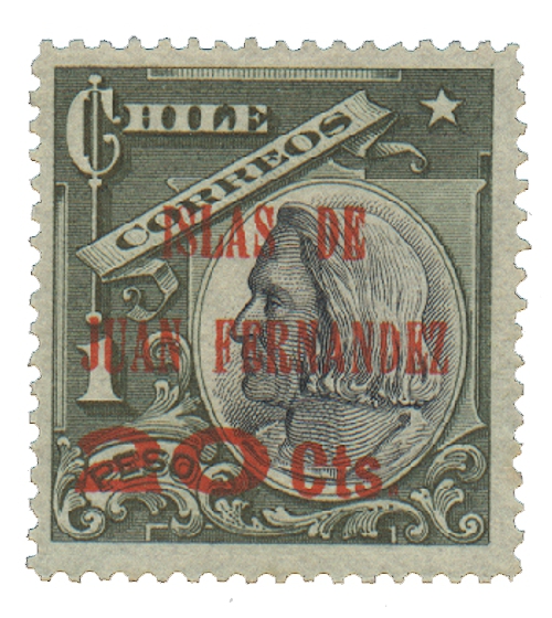 Además, en este mismo año del Centenario, se emitieron otros Cuatro sellos de la Serie Peso de Bronce, pero con la Sobrecarga “ISLAS DE JUAN FERNANDEZ”. Tres de ellos fueron recargados además con nuevos valores de franqueo: el de Doce centavos, carmín y negro con sobrecarga “5” de color azul; uno de $ 1, verde gris, con sobrecarga de 10 centavos y otro de $ 1, verde gris, con sobrecarga de 20 centavos, ambas de color rojo A ellos se agregó el de el de $ 1, verde gris, con sobrecarga color rojo, pero sin valor. En 1968 se emitió un sello color rosa granate, de 30 centavos, en el cual se representa en forma alegórica a Robinson Crusoe, con un antiguo fusil, mirando hacia el horizonte.