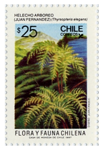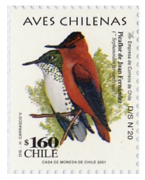 Siendo las 3.34, hora de Chile, en la madrugada del 27 de febrero de 2010, la zona central-sur de nuestro país fue sacudida por un violento Terremoto que alcanzó 8.8 grados de magnitud. Aun cuando el sismo, como tal, casi pasó inadvertido en las islas, ellas fueron inundadas a continuación por olas gigantescas (Tsunamis) de 15 metros de altura las que penetraron hasta tres kilómetros al interior, destruyendo viviendas costeras, diez víctimas fatales y seis desaparecidos. La población isleña no fue advertida oportunamente para ponerse a salvo de esta catástrofe. Han sido investigadas las responsabilidades por estas graves omisiones, debidas a posibles discordancias institucionales o a fallas técnicas en los sistemas de alarma. Año y medio después, el 2 de septiembre de 2011, un avión de la Fuerza Aérea de Chile, CASA 212, luego de realizar un fallido intento de aterrizaje, se estrelló en el mar frente a la isla Robinson Crusoe, falleciendo sus tres tripulantes y los dieciocho pasajeros. Estos últimos integraban un equipo de prestigiosos profesionales, que se dirigían al archipiélago Juan Fernández para colaborar en la reconstrucción de los graves daños causados tras los Tsunamis. A la fecha, enero de 2011, se han logrado recuperar sólo quince de los veintiún fallecidos en el impacto y continúa en curso una cabal investigación para determinar las causas de este tan lamentable accidente aéreo, en el cual perdieron la vida apreciados compatriotas, que se habían destacado en el ámbito nacional por sus valiosos, inteligentes y generosos aportes a la comunidad. La Filatelia y el Archipiélago Nos habíamos referido anteriormente a los primeros sellos de la Serie Peso Bronce y del Primer Centenario de la Independencia emitidos con las Sobrecargas “Islas de Juan Fernández” e “Isla de Mas Afuera”, como también al sello de 1968-1969 de 30 centavos, color rosa granate, con la figura de Robinson Crusoe. Posteriormente se realizaron distintas y hermosas emisiones de sellos sobre el Archipiélago Juan Fernández, desde 1974 al 2001, los que han sido muy apreciados por su colorido y belleza, especialmente los conmemorativos dedicados a la fauna isleña autóctona. Entre los más importantes y excepcionales representantes de ésta, se destaca el PICAFLOR ROJO, una de las diez aves endémicas en peligro de extinción en Chile, pues solamente quedan 400 de ellas. Su mayor característica es su excepcional capacidad de suspenderse en el vuelo. El macho es de un color rojo ladrillo y la hembra de color verde brillante. El Picaflor Rojo junto a la LANGOSTA DE JUAN FERNANDEZ son los que más han aparecido en los sellos (Emisiones de 1974,1987, 2000 y 2001). Respecto a los mamíferos, la Cabra salvaje es el más abundante y representativo de las islas, aun cuando la especie fue introducida por los primeros navegantes españoles. Existe tan sólo un sello de ésta, emitido en 1974.Por otra parte, la tan conocida Langosta de Juan Fernández, crustáceo que habita en fondos rocosos y cuevas marinas, constituye todavía el tradicional y principal recurso económico del archipiélago. En las últimas décadas ha existido una sobreexplotación de este crustáceo, pese a la existencia de limitaciones y regulaciones. Asimismo están reglamentadas las capturas de la Jaiba Corredora y del Cangrejo Dorado. Este último habita en abundancia en las profundidades del mar costero.