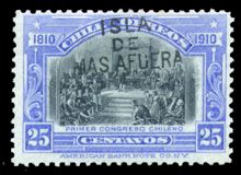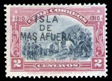 Se comenzaron a emitir, con sobrecargas relativas al Archipiélago, desde comienzos del pasado siglo XX. Los primeros aparecieron cuando aún sólo se imprimían sellos con la efigie o busto de Colón. Nos referimos a cinco estampillas de la denominada Serie del Peso Bronce de 1904, las que se emitieron en 1909 con la Sobrecarga “ISLAS DE MAS AFUERA” en color negro. Ellas fueron: la de Un centavo color verde, de Dos centavos color rosa, de Tres centavos color castaño claro, de Cinco centavos color azul y la de Diez centavos de colores gris y negro. Al año siguiente, en 1910, se editaron Once sellos de los conmemorativos del Primer Centenario de la Independencia Nacional, con la misma sobrecarga “Islas de Más Afuera”.