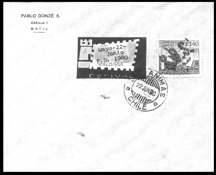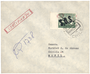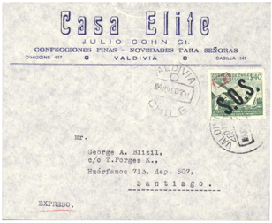Sobre enviado del Centro Filatélico de Valdivia al Círculo Filatélico de Curicó, franqueado con el 3 $ Cuarto Centenario de Valdivia, sobrecargado S.O.S. en diagonal. Despachado el 1 de Julio de 1960, recibido en Curicó el 4 de Julio. |